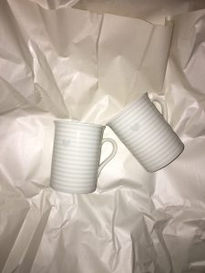 Keskiviikko samaa rataa yskien, koulua käyden ja koulun jälkeen hellun tykö. Kotimatkalla kävin matkahuollossa uusimassa bussikortin, jotta pääsen seuraavana päivänä kouluun ja kotiin. Bussia odotellessa kävin vähän ostoksilla. Löysin Tokmannilta pari valkoista mukia harmailla raidoilla ja harmaalla sydämellä, (kuvassa) ajattelin antaa ne hellulle aikasena ystävänpäivä lahjana. Siinä toivossa, että pitäis niistä enemmän, kuin siitä kala mukista joka hajosi. Kotia päästessä yskänlääkettä ja finrexiä naamaan, saunaan lämmittelemään ja pesemään maalitahrat hiuksista. Villasukat jalkaan ja fleece kylpytakki päälle ja peiton alle!💤