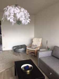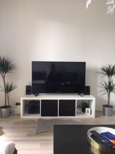 Sohvan vastapäätä löytyy ikean tasolla mun 49 tuuman tv ja molemmin puolin ikeasta ostetut ihme kasvi palmu hommelit. Tuolin sain äitiltä, toinen samanlainen on parvekkeella. Säkkituolin ostin fb kirppikseltä, sohvapöyvän sain perhetutulta uutena ja sohvan vieressä oleva pieni pyöreä pöytä on Tokmannilta ja makso 15€, lamppu on K-Raudasta, mutta hintaa en kyllä muista, äiti sen osti mulle. Mun musta ikean kokovartalopeili on löytäny paikkansa olohuoneesta tv tason vierestä.