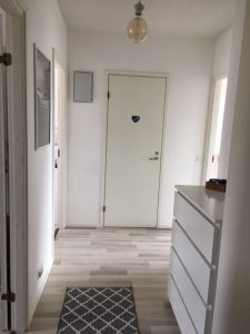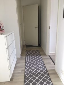 Tuo valkoruudullinen matto on Rustasta ja makso about 12€, se tuo hyvin tuota lattiaaki esiin ja antaa pituuden tunnetta tähän tilaan. Lipasto on ikean malm sarjaa, koko 100cm x 80cm tämän ostin käytettynä. Eteinen on ihan simppeli, ei mitään ylimääräistä. Taulu, joka on seinällä on CanvasPicassosta kuten myös myöhemmin nähtävät olohuoneen kaks taulua. En oo ottanu mitää hyvää kuvaa tosta taulusta, mutta siinä on sellanen maisema Suomen luonnosta ja siinä lukee Finland. Kehykset näihin tauluihin on ikeasta 8€/kpl. En omista naulakkoa, hengaritanko löytyy välioven takaa kaapista, sinne oon myös laittanut ison korin, ihan vain omaa arkea helpottaakseni, voin vain viskata takin sinne koriin ja ku käy kavereita kylässä, nii neki aina viskaa takit korii elleivät piä päällä.