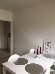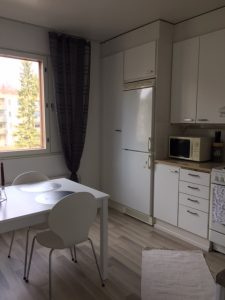 Ruokailutuolit oon ostanu fb kirppikseltä, ruokapöytä on Maskusta, senkin pyöristetty hinta löytyy samasta postauksesta kuin sängyn hinta. Pöydän tabletit on Tornion Texistä, kynttelikkö ja taulu Prismasta yhteishintaan 8€. Jos nyt tarkkaan katoit huomasit, että mikro on aika keltanen, johtuu siitä, että sekin on vanhempi ku mie ja otettu kotoa varastosta. Joskus ostan hienon ja pienemmän ku koen sen tarpeelliseksi. Tiskikone oli täällä valmiina, siitä ei oo mitään kokemusta, koska oon tiskannu käsin, en tunne tarvetta käyttää sitä, ku tulee muutenkin tosi vähän astioita. Verhot on äitin kaapista, neki ikivanhat.