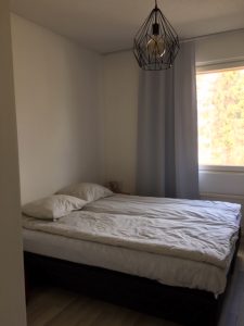 Matto on Rustasta ja makso 5€ ja vaaterekki on ostettu fb kirppikseltä, sänky on Maskusta jotain 300-400€ muistaakseni, oon maininnu hinnan aikasemmin jollain postauksella, verhot on Tokmannilta 10€/kpl, lamppu K-Raudasta hintaa en muista, tuo iso hehku on ostettu erikseen sen hinta oli 15€, samanlainen hehku löytyy eteisen katosta, ilman mitään kupua tms. Sängyn takaa ikkunan vieressä on puunvärinen yöpöytä, joka on meiltä kotoa ja vanhako mikä.