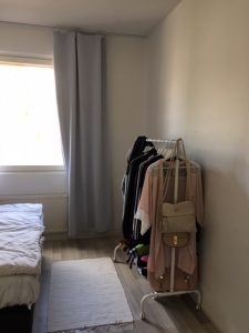 Eteisen vasemmalta puolelta löytyy mun makuuhuone, sielläki vallitsee aika tasanen harmaa valkonen teema, makuuhuone saa väriä aina petivaatteiden vaihdon yhteydessä, välillä saattaa löytyä piristävän keltaset kukka petivaatteet ja välillä ihan perus valkoset. Väriä tuo myös vaaterekki, jossa vaihtuu vaatteet aina käyttökohteen mukasesti. Tarkkaan ku kattoo nii sieltä kenkätelineeltä löytyy läjä pehmoleluja ja vilttejä, ne mie aina sillon tällön viskon sänkyyn, jotta se näyttäis pedatulta. Tosi harvoin petaan petiä, yleensä vain sillon ku oon siivonnu tai tulee vieraita, niinkö nyt se on pedattuna pikasesti.