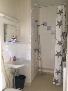 Palataan jälleen kerran käytävälle ja mennään käytävän päässä olevasta ovesta sisään ja sieltä löytyy pieni wc ja suihku. Se nyt on niinki perus mitä olla voi, pienillä tuuningeilla siitäki sai nätin, suihkuverhon sain siskolta ja pistin tuollaset joulu ledi valot antaan tunnelmaa. Pyykkikone löytyy kaappien vierestä ja äitin virkkaaman pöytäliinaksi tarkotettu matto löysi paikkansa mun wcn lattialta. Täälä ei ole oikeestaan mitään erikoista, muutako delfiini laatat, suihkun seinässä, jotka paljastu tarroiksi ku tarkempaa tutkiskeli.